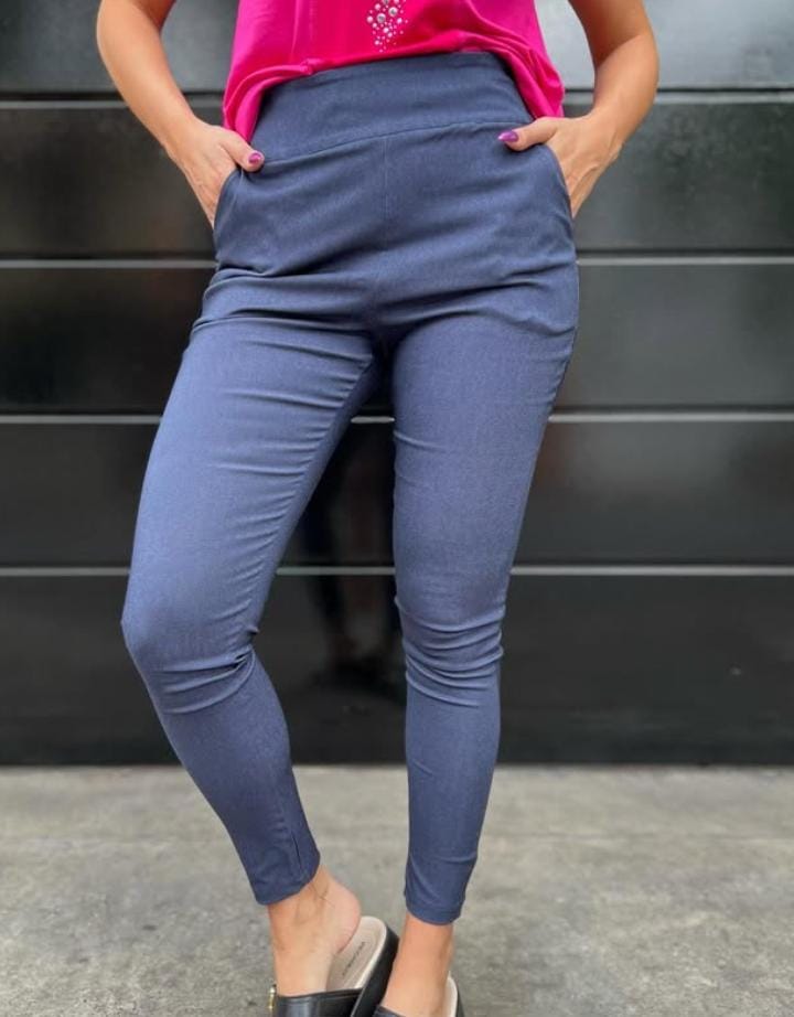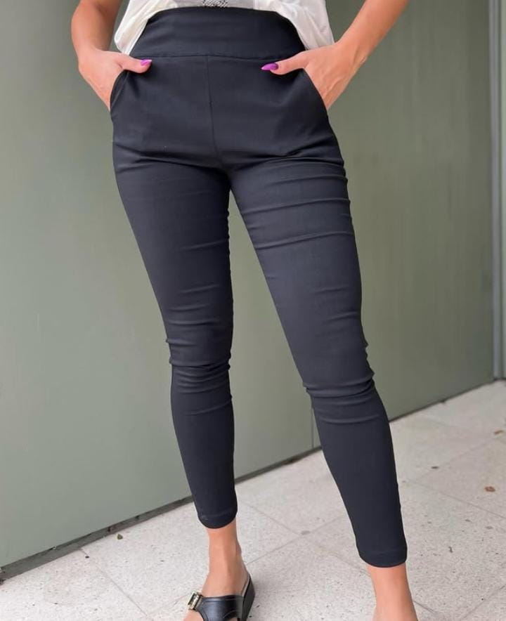 Pantalón en tela bengalina elastizado con bolsillos invisibles en sus laterales y cierre con una faja en su cintura, ideal para complementar el outfit formal de oficina (ejemplo).