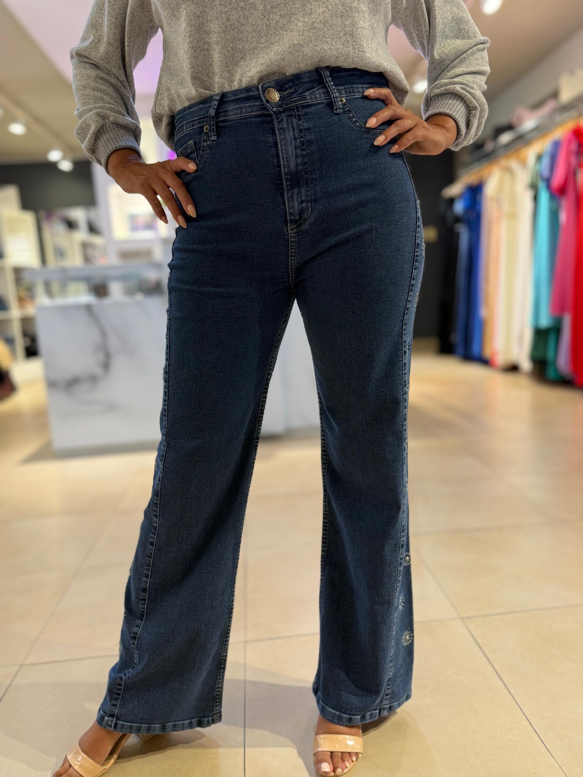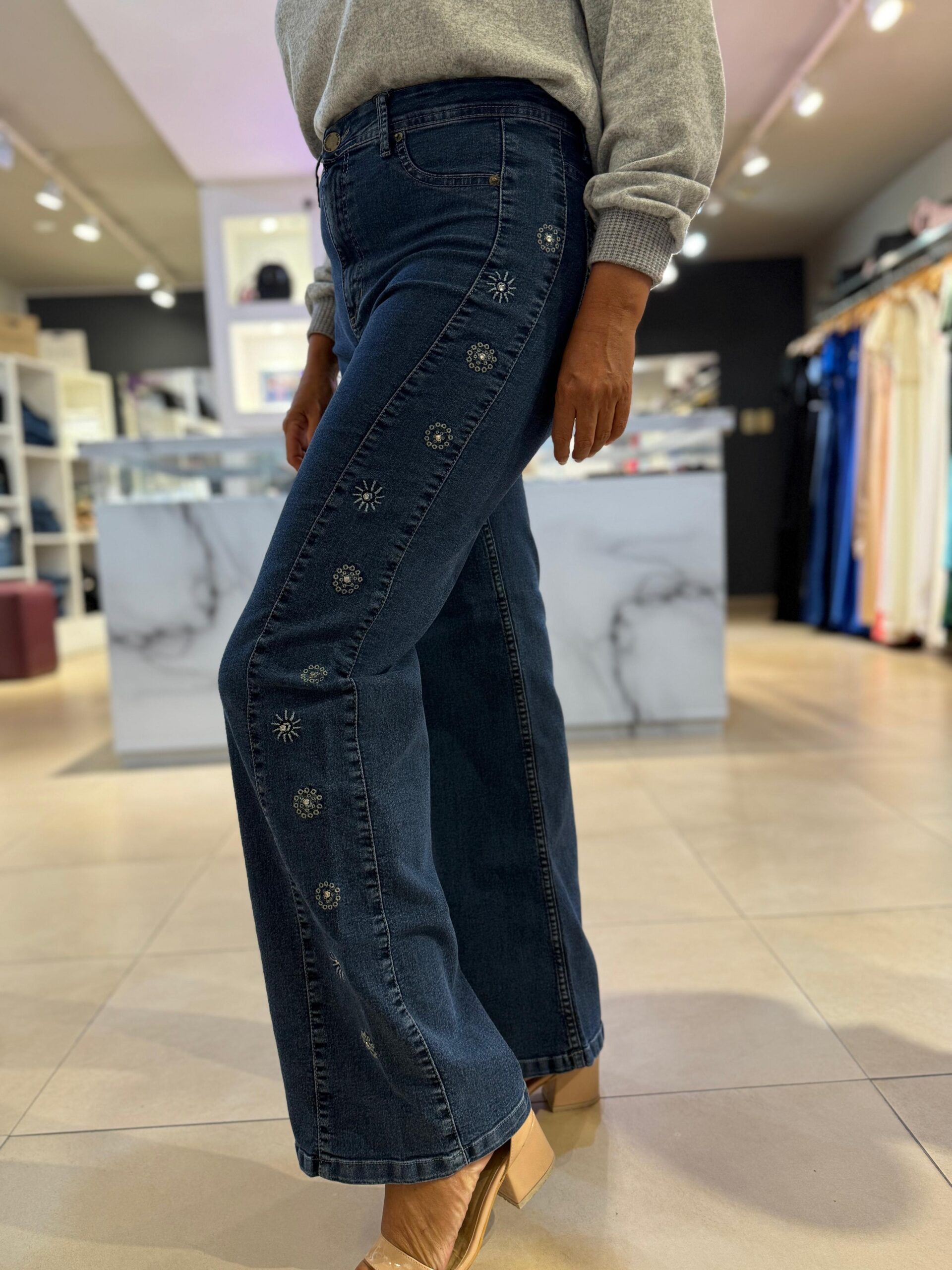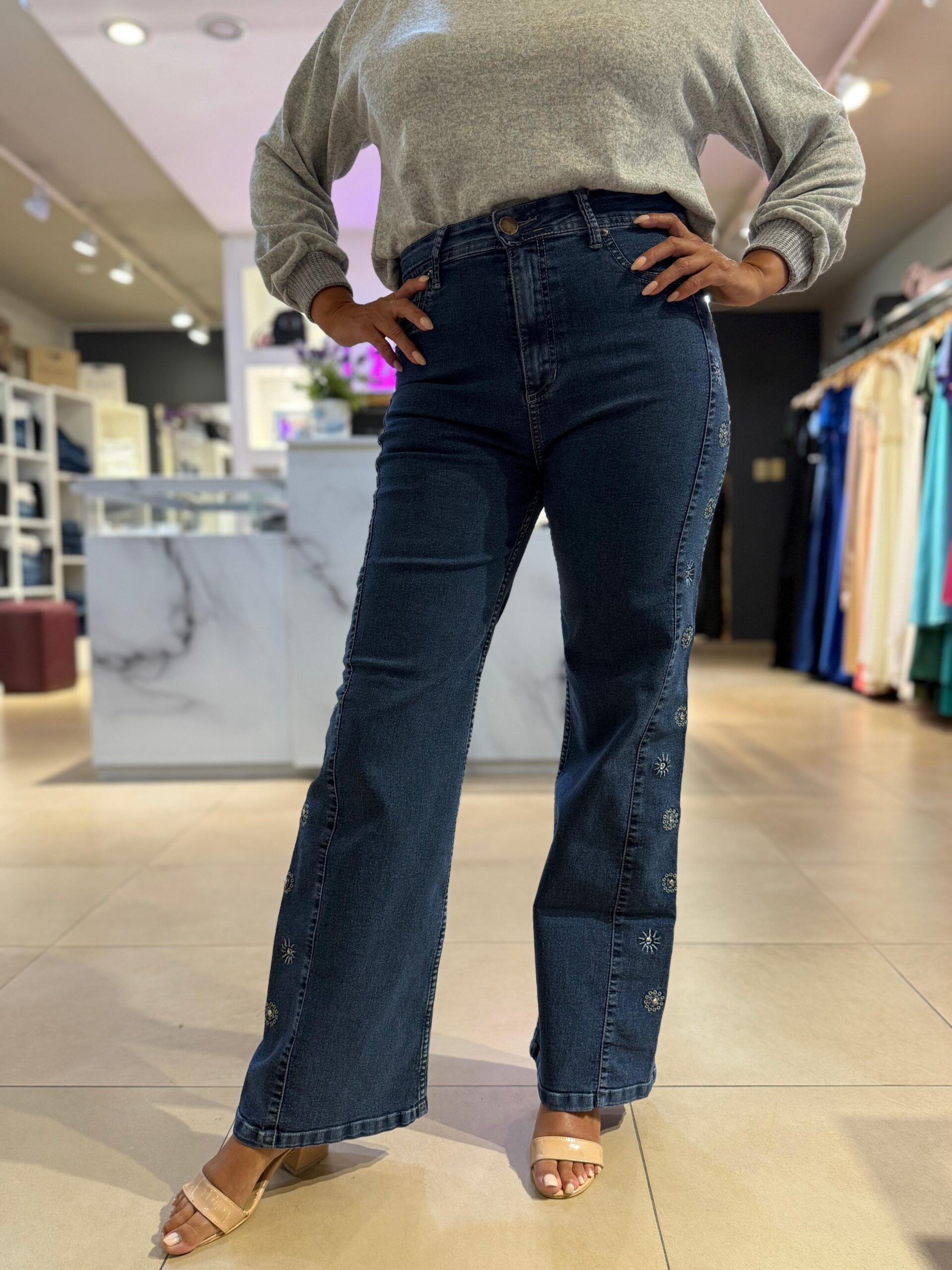 Pantalón elastizado en una lona de jeans super cómoda y liviana, con detalles a sus costados en bordado de hilo y aplique en strass, de la nueva coleccione de invierno.