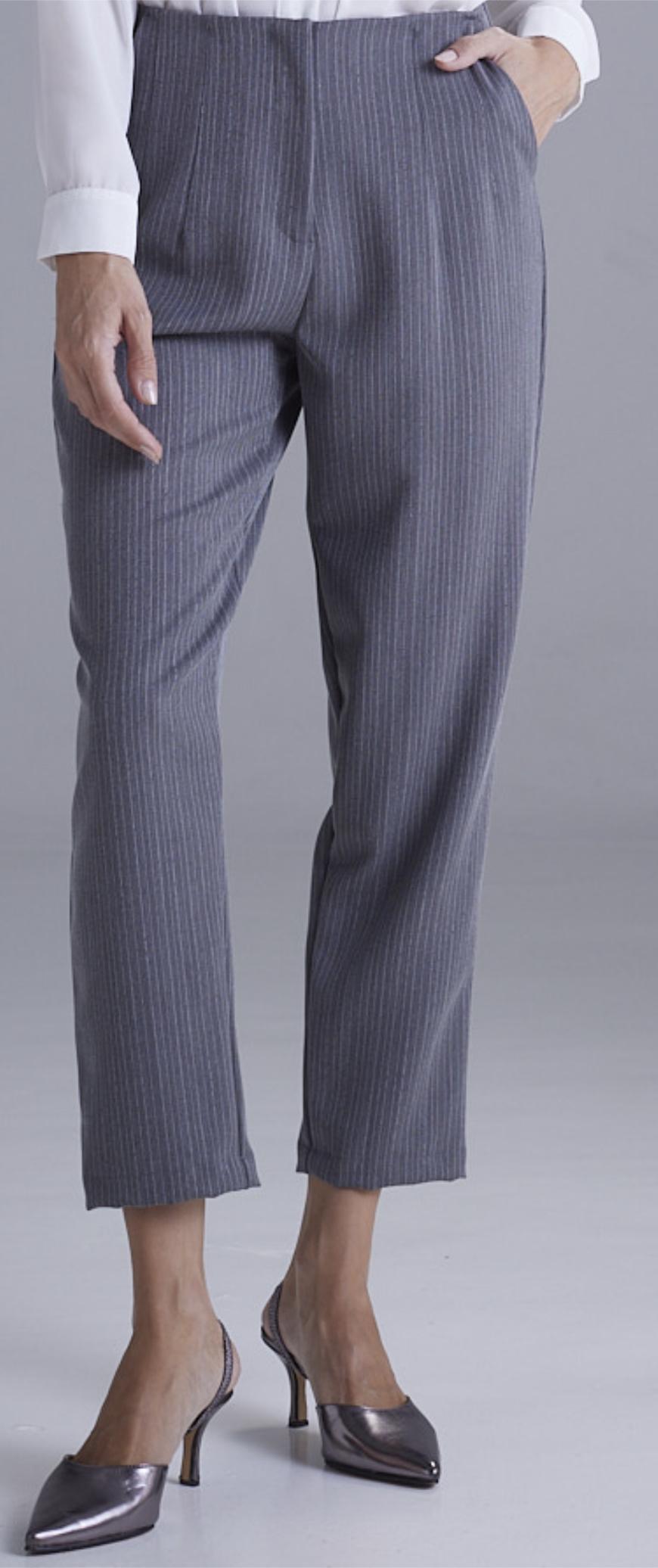 Pantalón satrero tiro alto con detalles en costura delantera y espalda con bolsillos, la tela tiene la delicada trama de rayas finas.