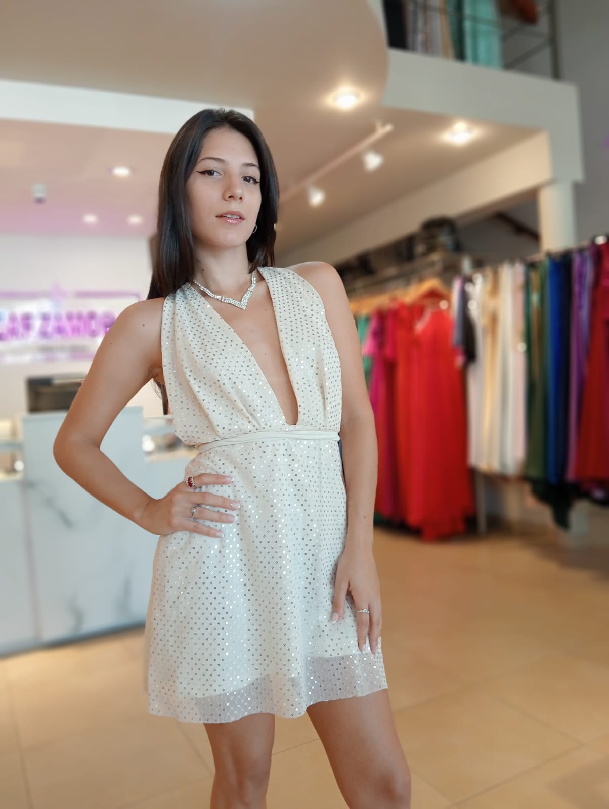 Vestido sueña corto en color whit con detalles bordado de lentejuelas en color plata complementa con una tela en tul, su largo es hasta arriba de las rodillas con un escote en v en la zona de bustos. Es un modelo versátil que se adapta al cuerpo con sus detalles en las tiras largas, podes regular a tu cintura realza lo estilizado y fino a tu comodidad. Es una modelo favorito y muy elegido.